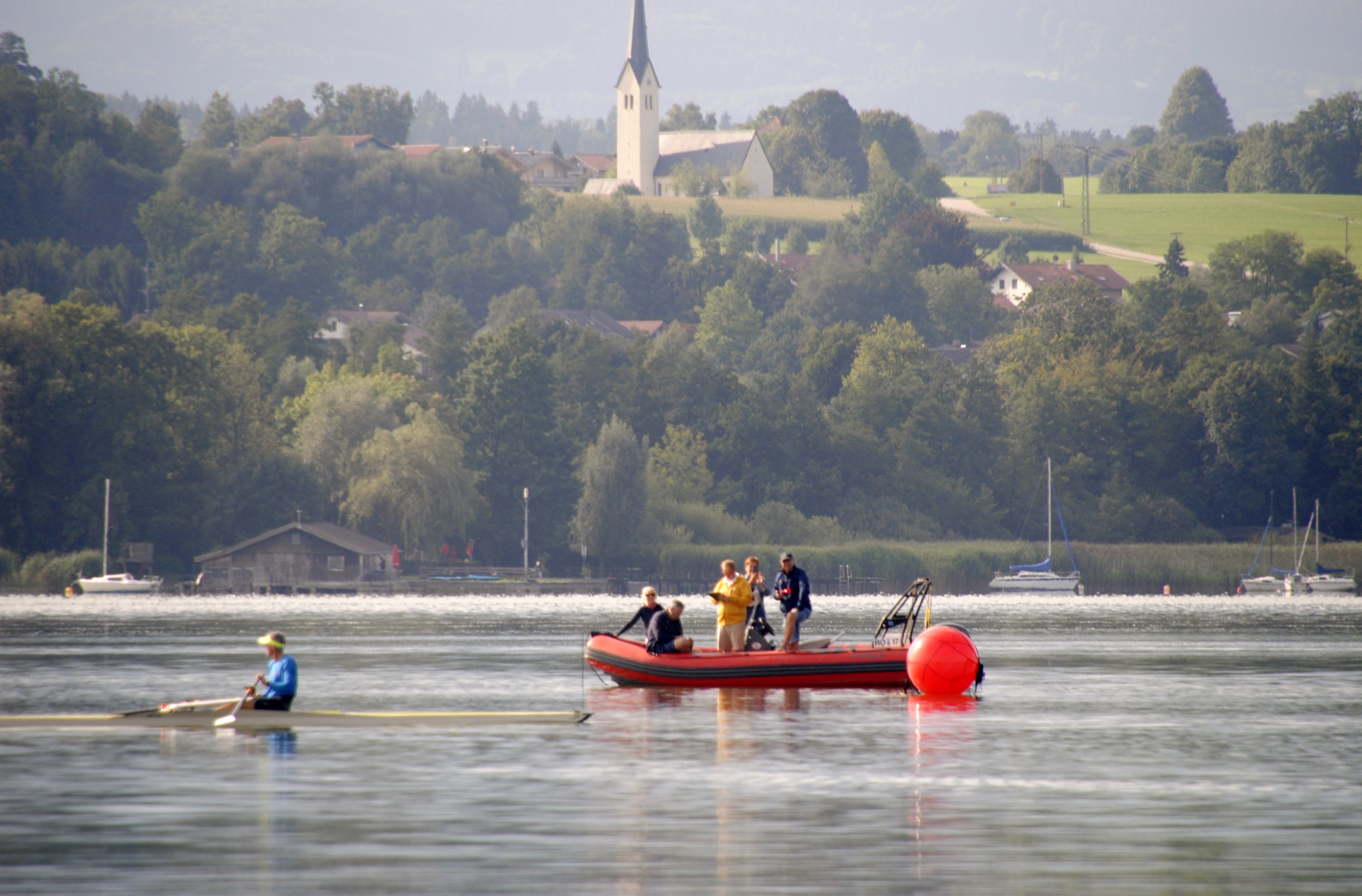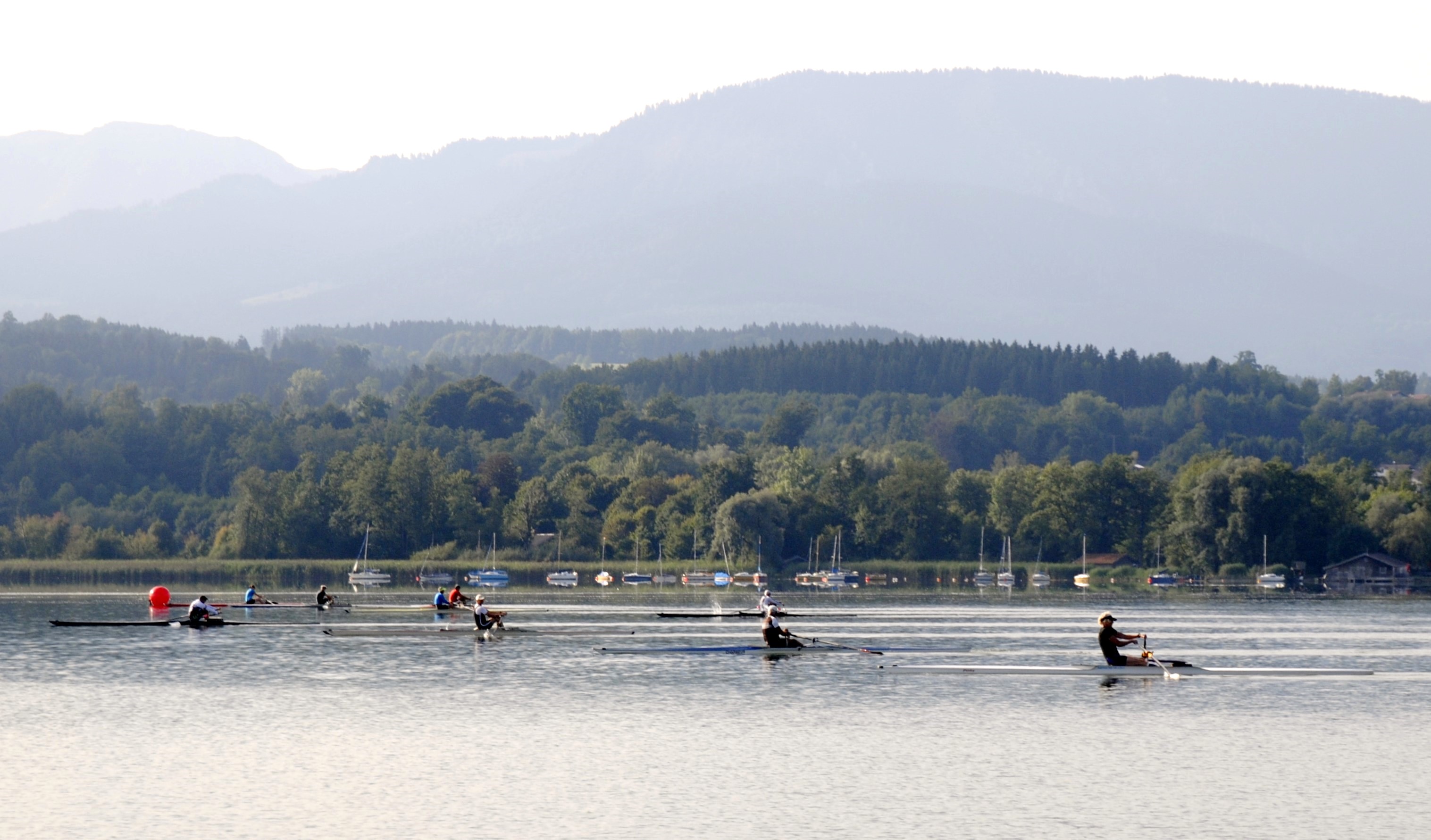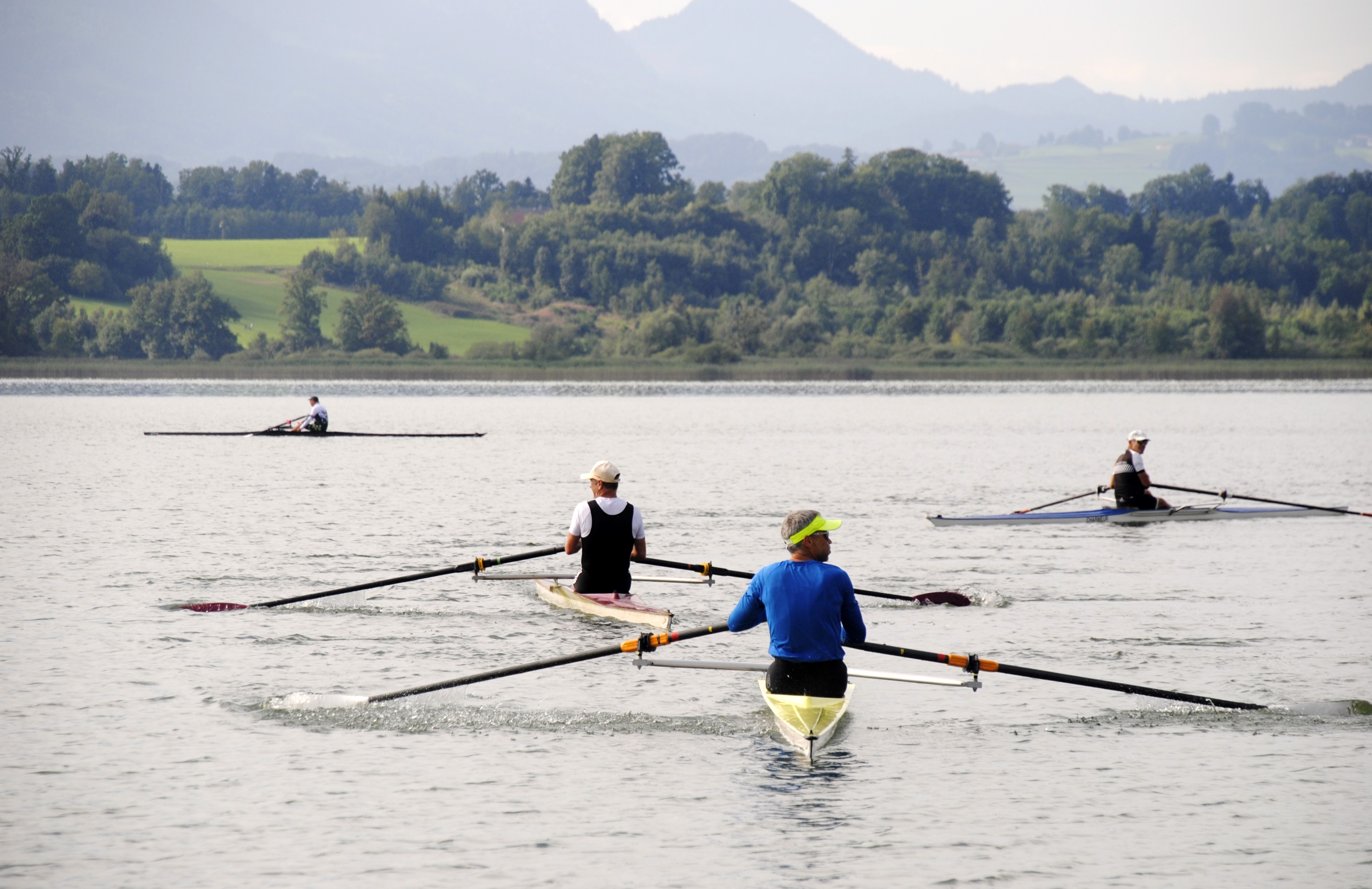 Simssee (ni) Gemeinsam führten der Segler und Ruderclub Simssee und der Rudersportclub Rosenheim auf dem Simssee eine gemeinsame Veranstaltung durch. Zehn Einer Ruderboote führten ein Rennen vom SRS-Clubgelände am Simssee nach Krottenmühl am anderen Ende des Sees und zurück durch. Nach einem spannenden und knappen Kampf siegte Dr. Wolfgang Niessen vom Segler- und Ruderclub Simssee vor Hans Härtl vom Rudersportclub Rosenheim und Hannes Herterich vom SR Simssee. Beste Dame wurde als Vierte Christine von Bary, Rudersportclub Rosenheim. Vergeben wurden auch zwei Pokale, einen für die beste Dame, und einen für den besten Herren. Anschließend gab es eine Brotzeit und ein gemütliches Zusammensein. Die beiden Ersten Vorstände, Klaus Rehm vom Rudersportclub Rosenheim und Hans Reile vom Segler- und Ruderclub Simssee zeigten sich sehr zufrieden und wollen künftig mehrere gemeinsame Aktionen machen.