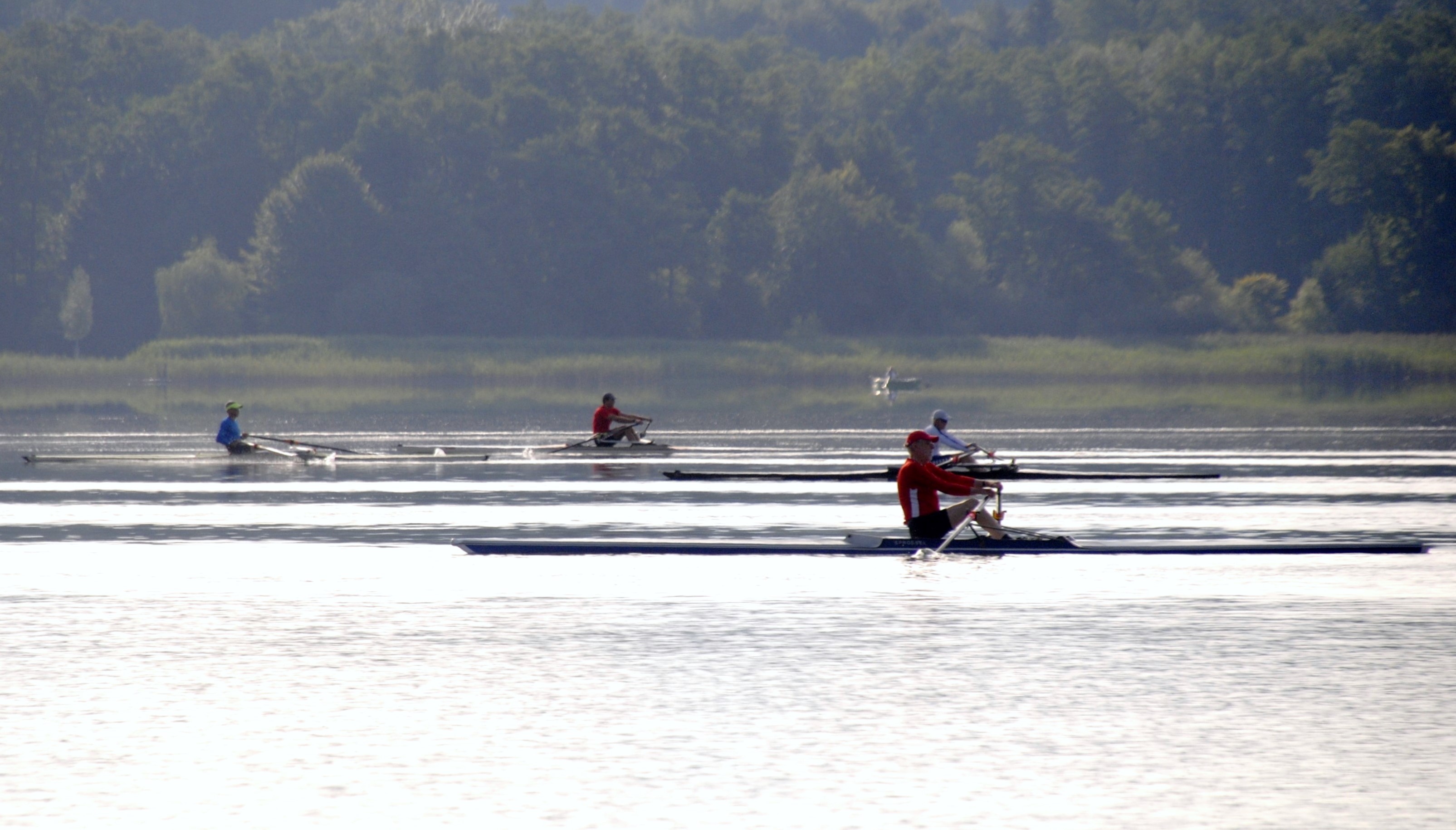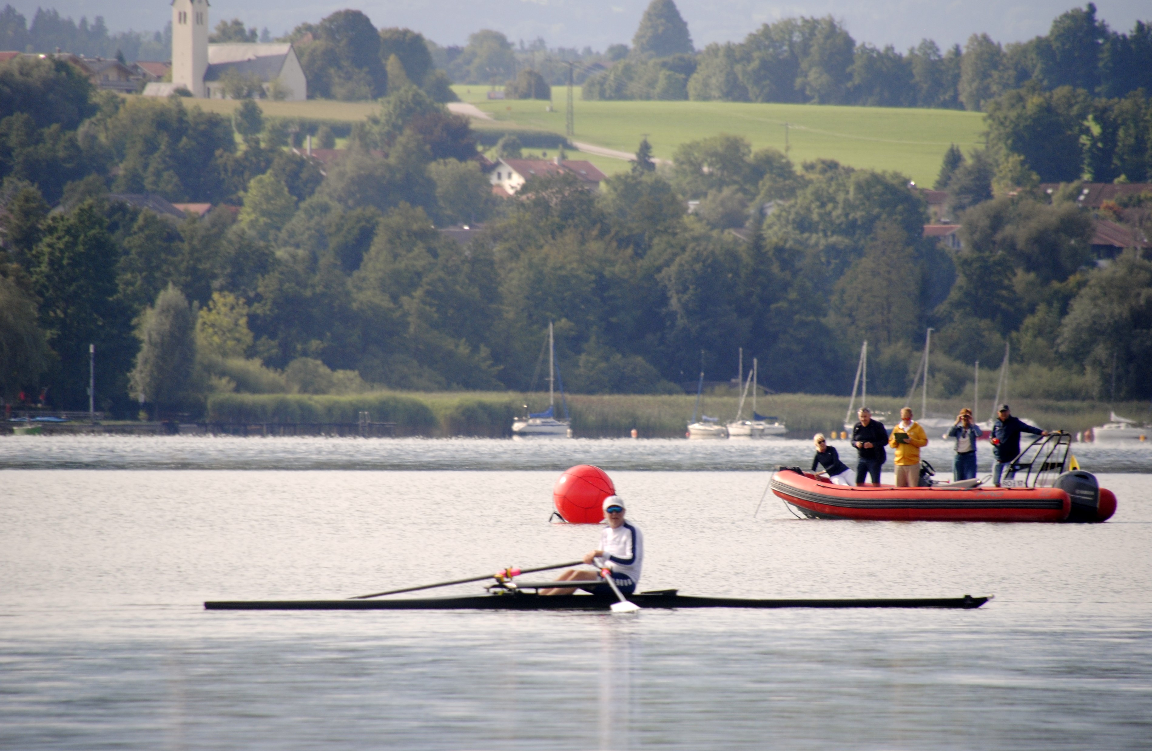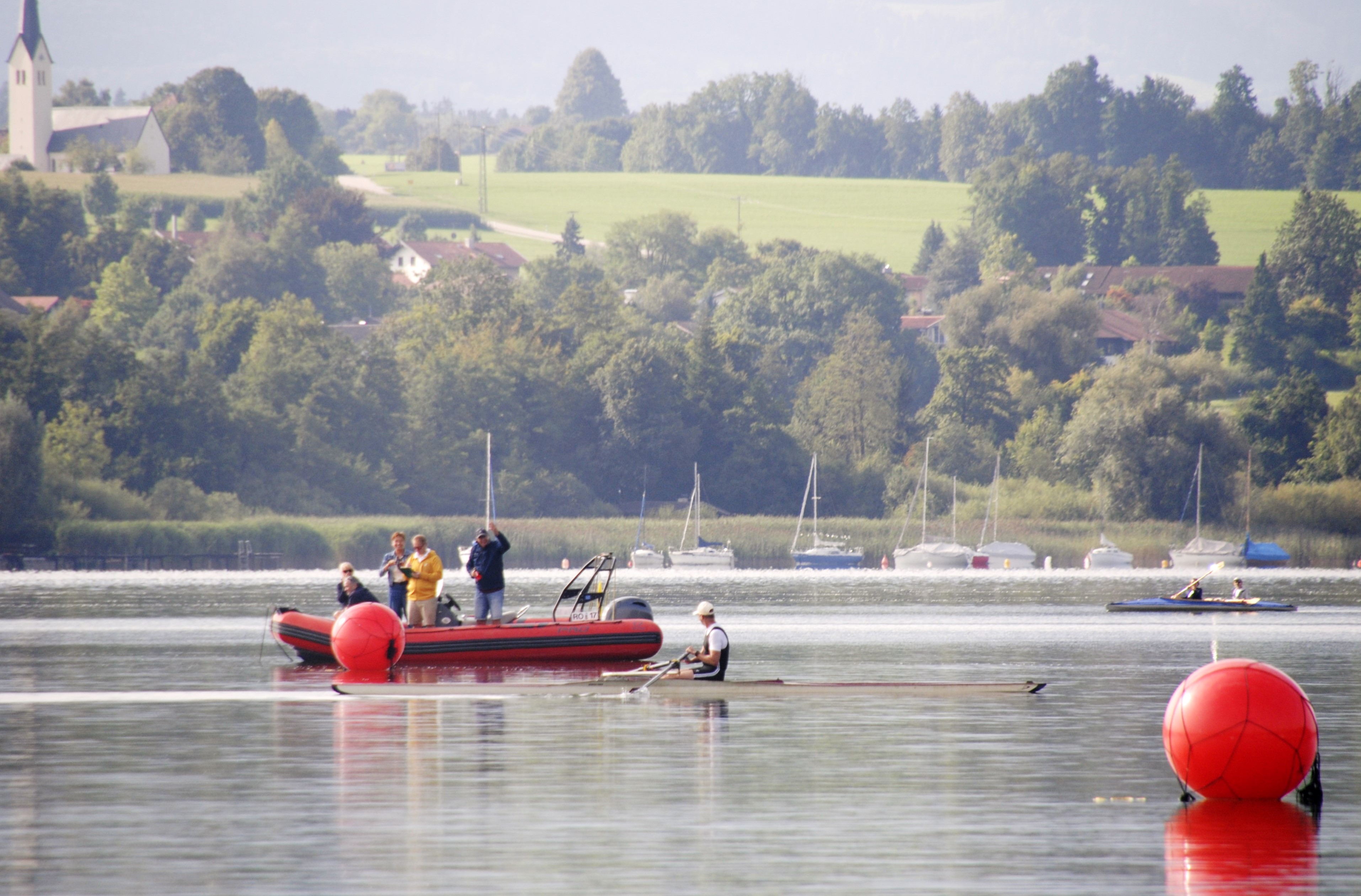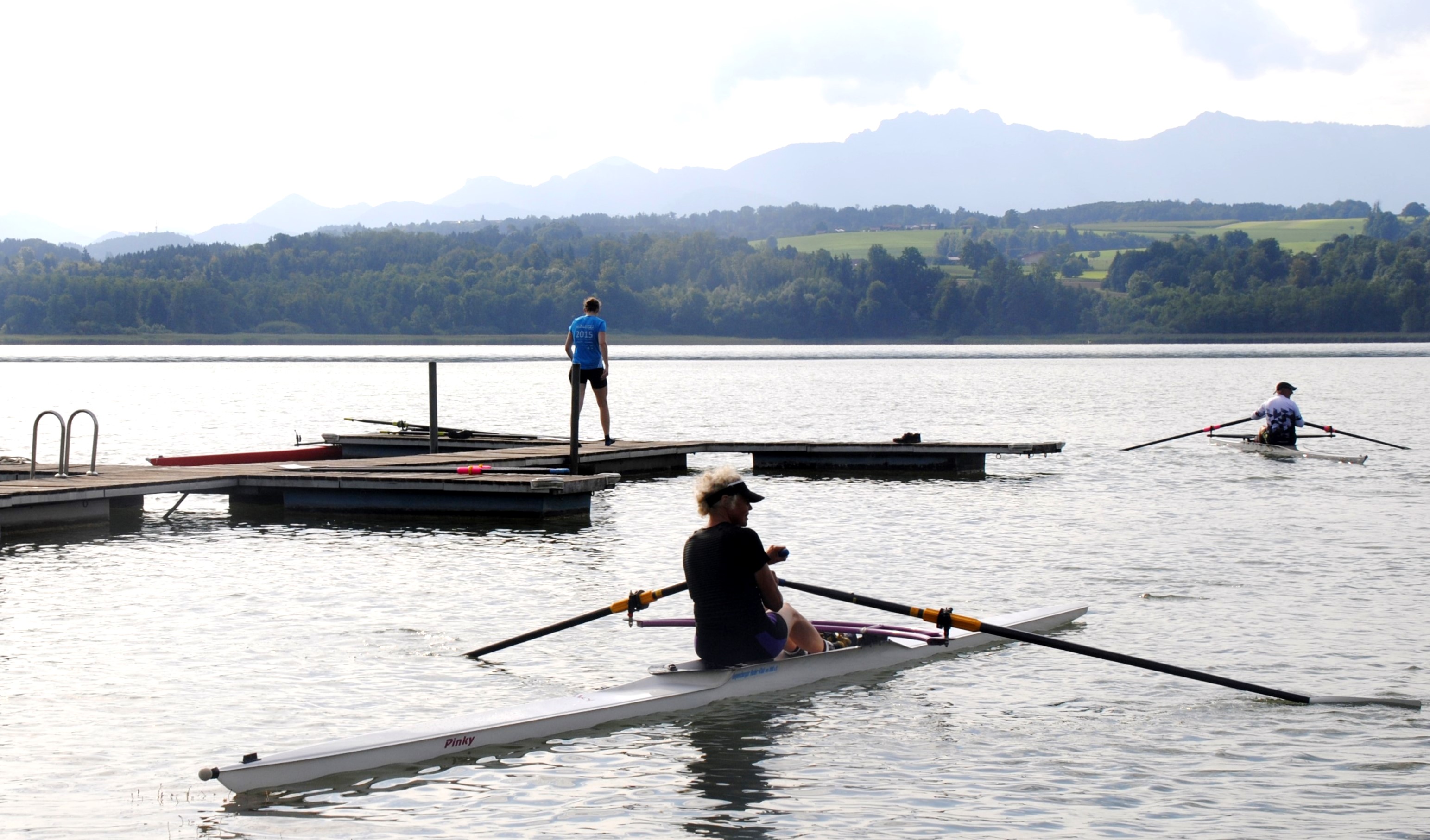 Simssee (ni) Gemeinsam führten der Segler und Ruderclub Simssee und der Rudersportclub Rosenheim auf dem Simssee eine gemeinsame Veranstaltung durch. Zehn Einer Ruderboote führten ein Rennen vom SRS-Clubgelände am Simssee nach Krottenmühl am anderen Ende des Sees und zurück durch. Nach einem spannenden und knappen Kampf siegte Dr. Wolfgang Niessen vom Segler- und Ruderclub Simssee vor Hans Härtl vom Rudersportclub Rosenheim und Hannes Herterich vom SR Simssee. Beste Dame wurde als Vierte Christine von Bary, Rudersportclub Rosenheim. Vergeben wurden auch zwei Pokale, einen für die beste Dame, und einen für den besten Herren. Anschließend gab es eine Brotzeit und ein gemütliches Zusammensein. Die beiden Ersten Vorstände, Klaus Rehm vom Rudersportclub Rosenheim und Hans Reile vom Segler- und Ruderclub Simssee zeigten sich sehr zufrieden und wollen künftig mehrere gemeinsame Aktionen machen.