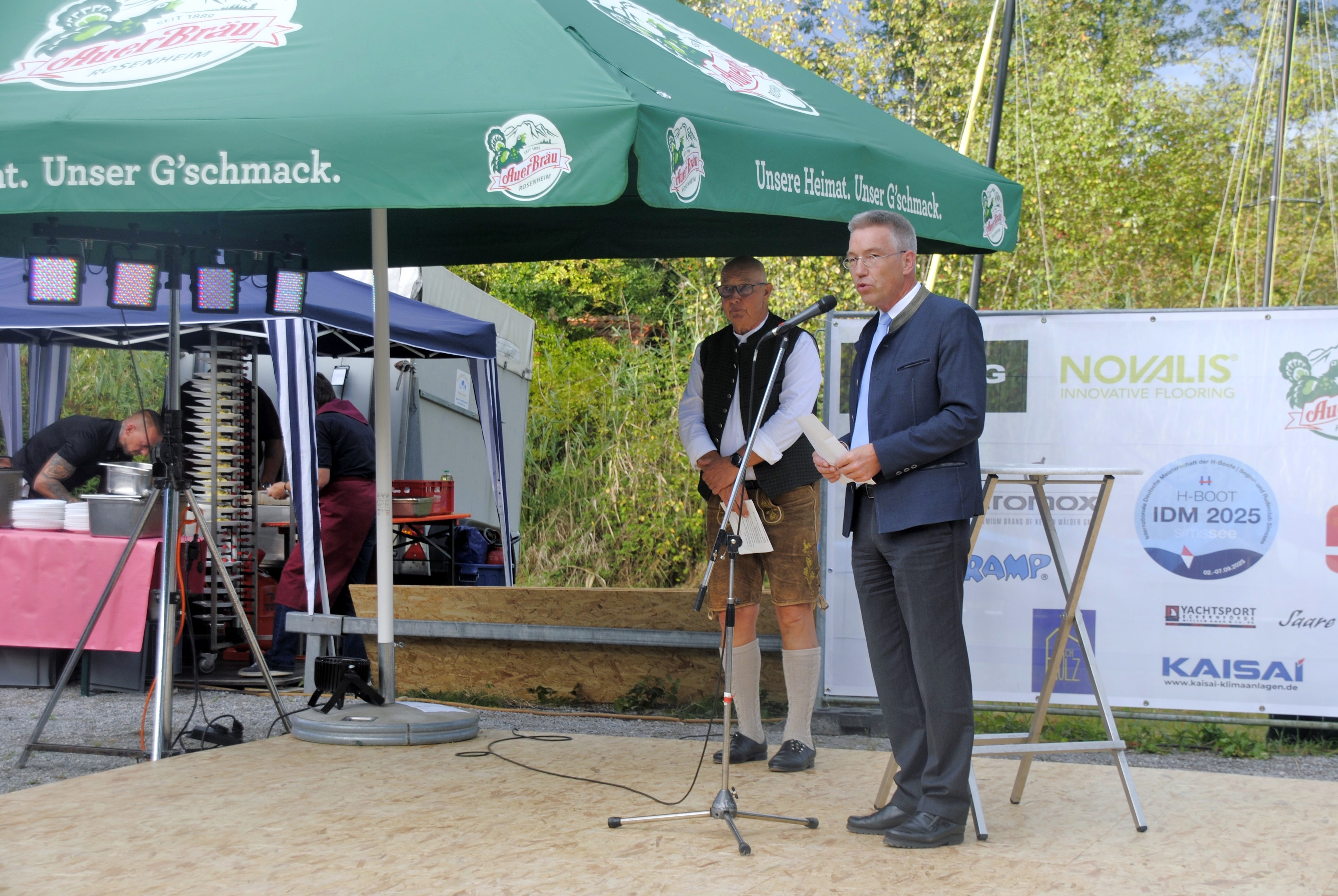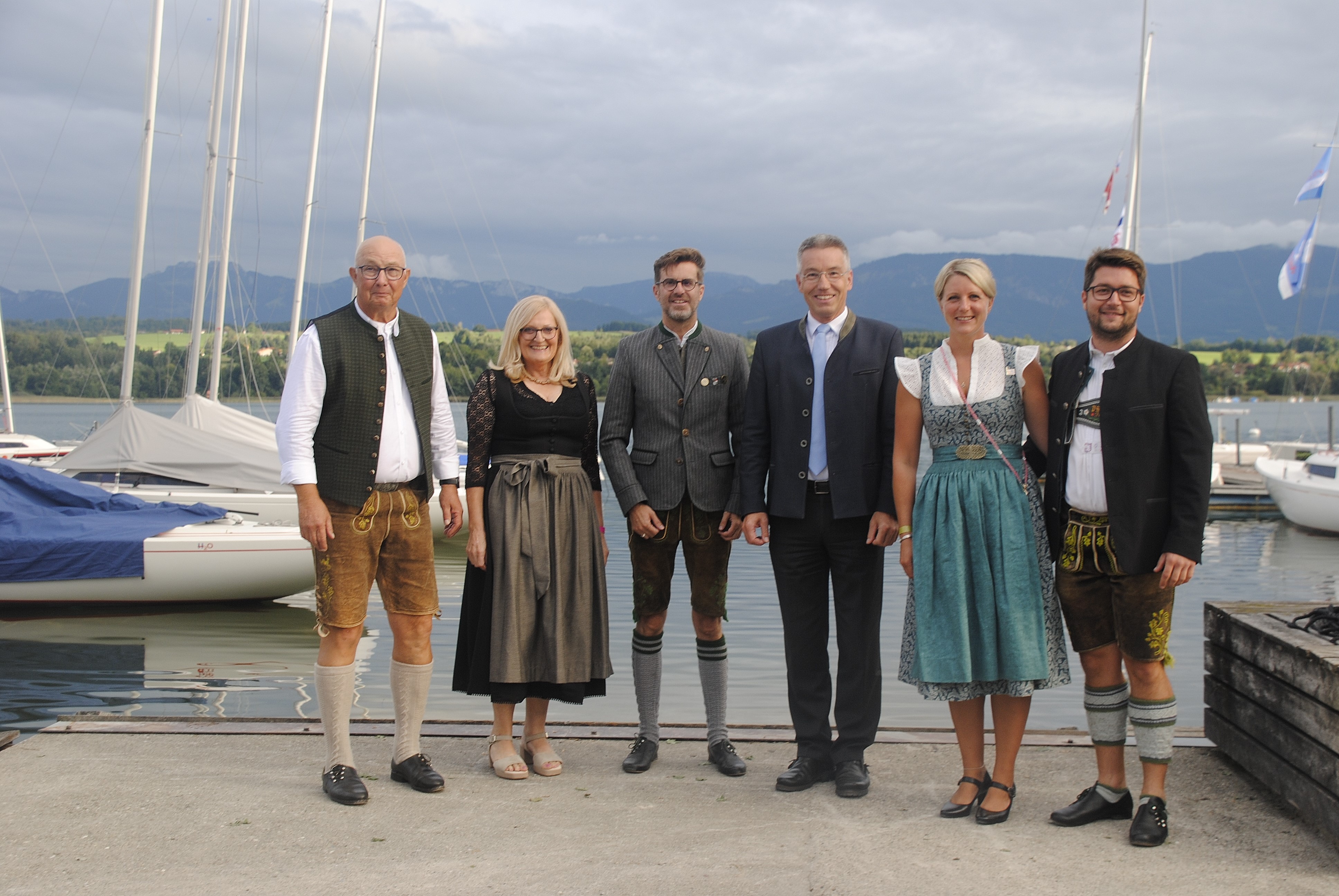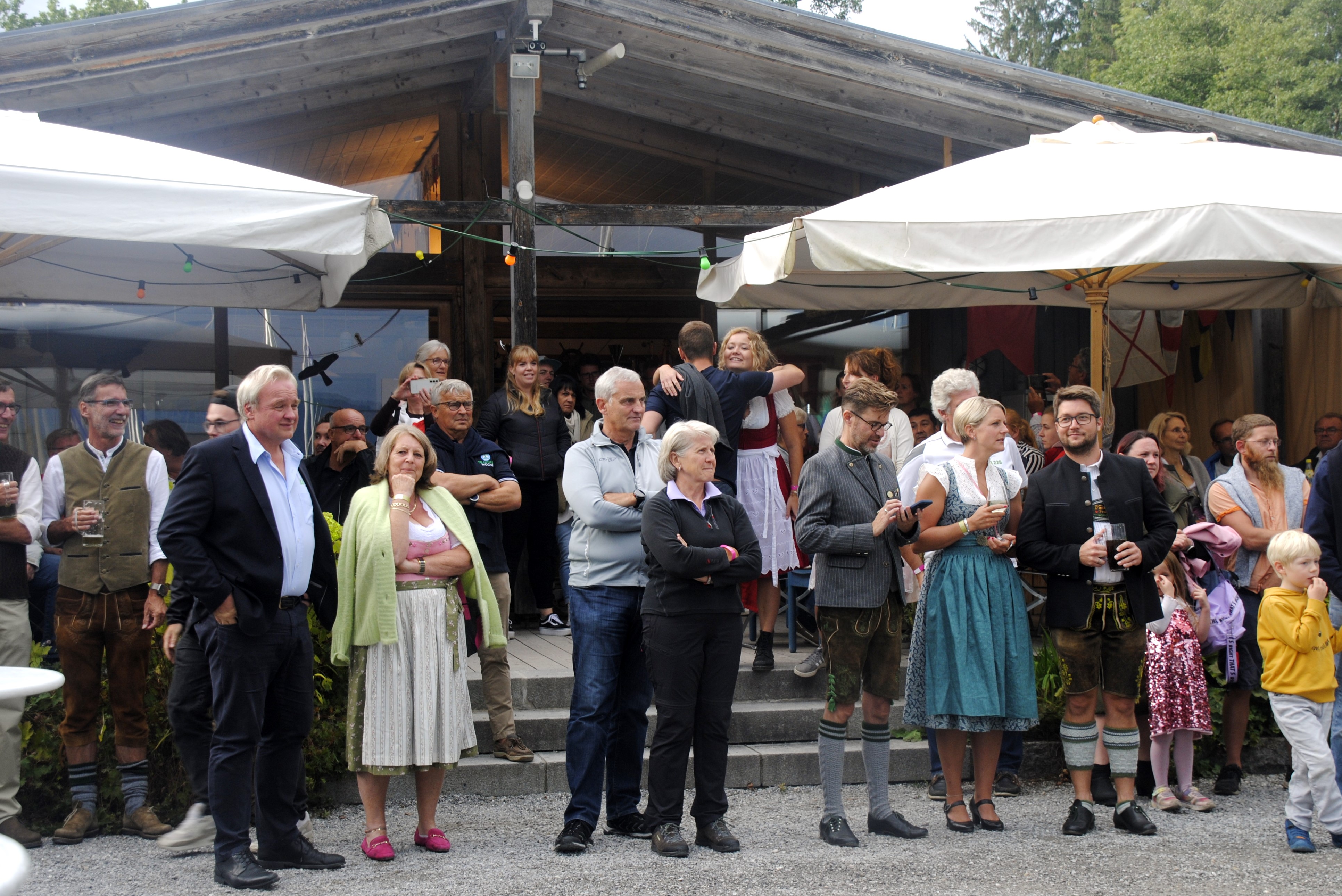 Simssee (ni) Viel Prominenz kam zur Eröffnung der Internationalen Deutschen Segelmeisterschaft der H-Boote beim Segler- und Ruderclub Simssee. Der Club liegt am Nordufer des Simssees in der Gemeinde Prutting. Nachdem Erster Vorstand Hans Reile, die Teilnehmer, Gäste und Sponsoren begrüßt hatte, ergriff Rosenheims Landrat Otto Lederer, der Schirmherr der Veranstaltung, das Wort. „Ich habe die Schirmherrschaft gerne übernommen und freue mich sehr, dass der tatkräftige SR Simssee dieses seglerisches Großereignis ausrichtet“, erklärte er. Auch Stephanskirchens Bürgermeister Karl Mair und Pruttings Bürgermeister Johann Thusbaß lobten das vorbildliche Engagement des SR Simssee. Der Vorstand der Deutschen H-Boot-Vereinigung, Christoph Zander, betonte, dass nicht nur Großclubs, sondern auch oft kleinere Vereine vorbildliche Arbeit leisten. Von der sportlichen Seite war Sybille Merk, Vizepräsidentin des Deutschen Seglerverbandes, angereist. „Ich freue mich sehr, dass ich zum Simssee gekommen bin, an dem ich schon im Jüngstenboot Optimist Regatten gesegelt bin“, meinte die erfolgreiche Seglerin, die 1996 bei den olympischen Spielen teilgenommen hat. Vom Bayerischen Seglerverband kam Chiemgaus Seenvertreter Karl-Heinz Zipfer und freute sich über das Engagement des SR Simssee. Auch Thomas Sandbichler, Vorstand vom Seebesitzerverband Simssee und Vertreter der Wasserwachten Pietzing und Baierbach waren gekommen. Nach dem offiziellen Teil saßen die Teilnehmer und Gäste bei einem „Bayerischen Abend“ mit Auftritt der Pruttinger Trachtenkinder und Goaßlschnalzer und Klängen der Stephanskirchener Blaskapelle im SRS-Clubhaus noch lange gemütlich zusammen.